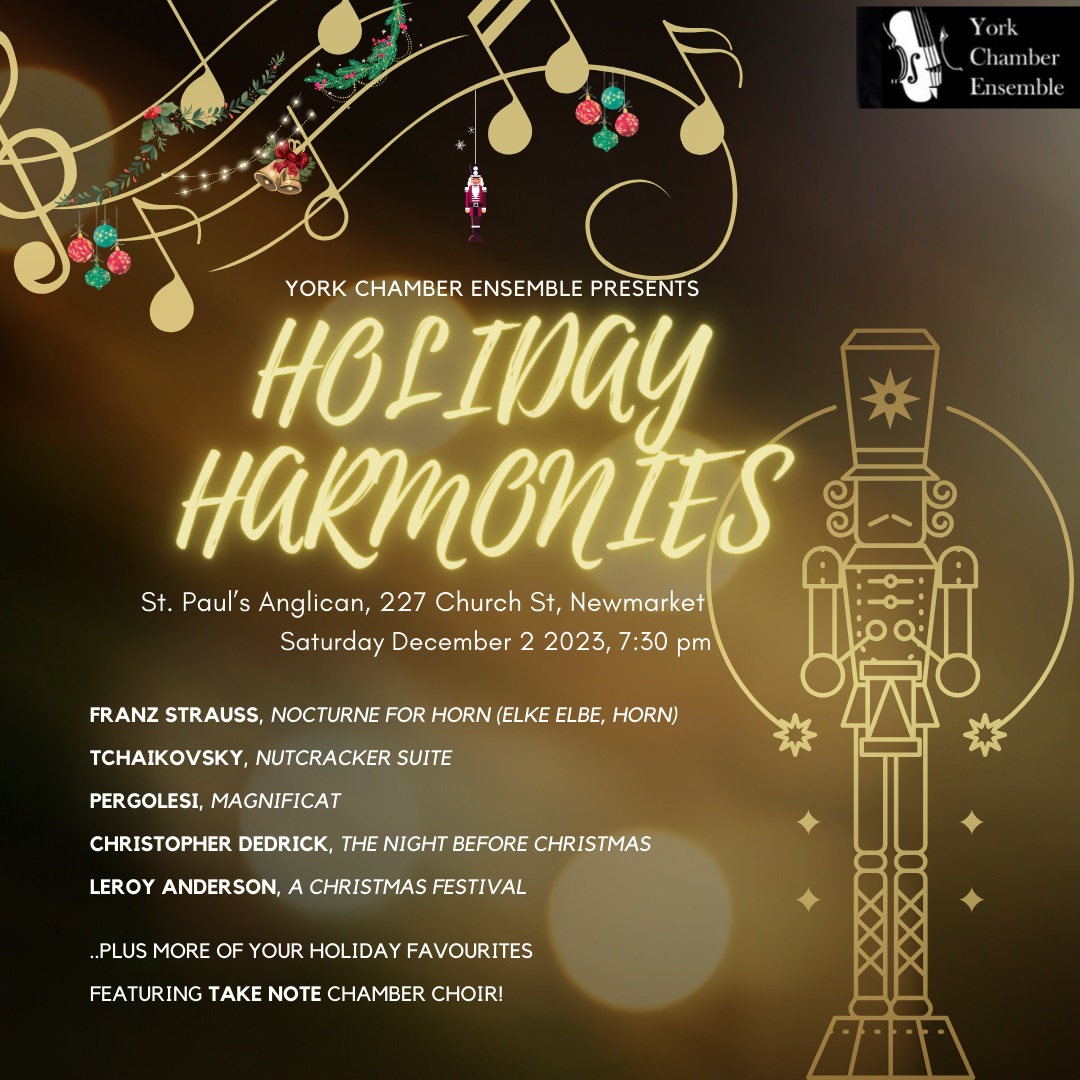 The YCE teams up with Take Note for this entertaining evening of music spanning many genres. Hear The Nutcracker Suite, The Magnificat, The Night Before Christmas, Nocturne for Horn (featuring Elke Elbe on French Horn), and lots of holiday favourites!